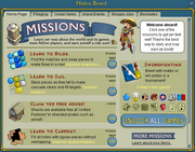 Após a criação de seu pirata, você verá um menu com três missões para tentar realizar. Você pode começar com um desses, ou clicar em "More Missions" para levar você a um quadro mostrando muito mais missions a fazer. A primeira missão que você deve tomar é chamada "Learn about your items", que o transporta para o Pollywog (Navio para missões). Após o tutorial com um NPP (Non-Pirate-Player [NPC])